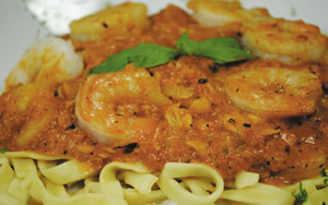 Jumbo shrimp with roasted red peppers in a creamy rosé sauce, over linguine